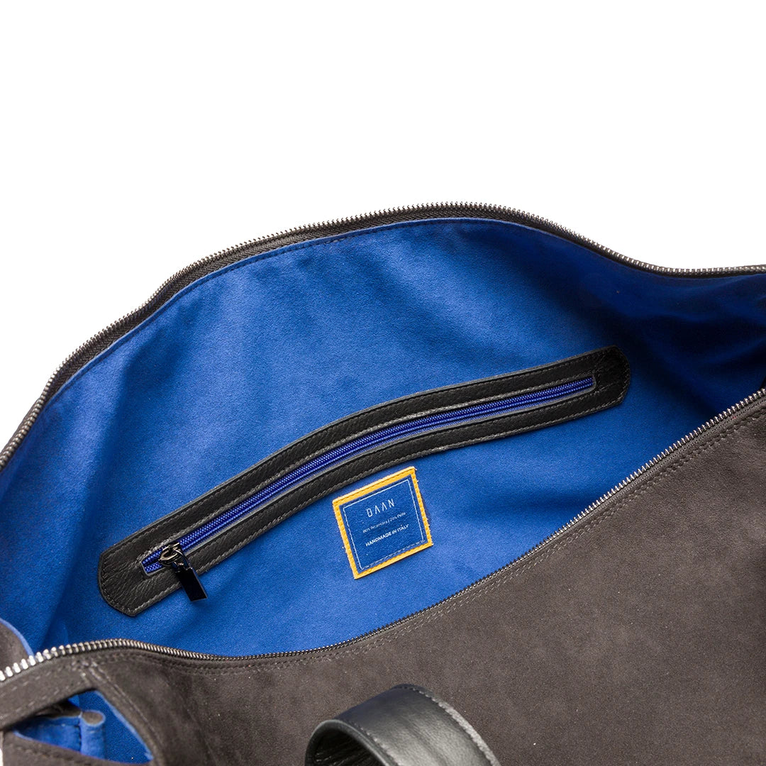 Realizzata a mano in Alcantara e pelle per accompagnare i tuoi viaggi con leggerezza e robustezza.